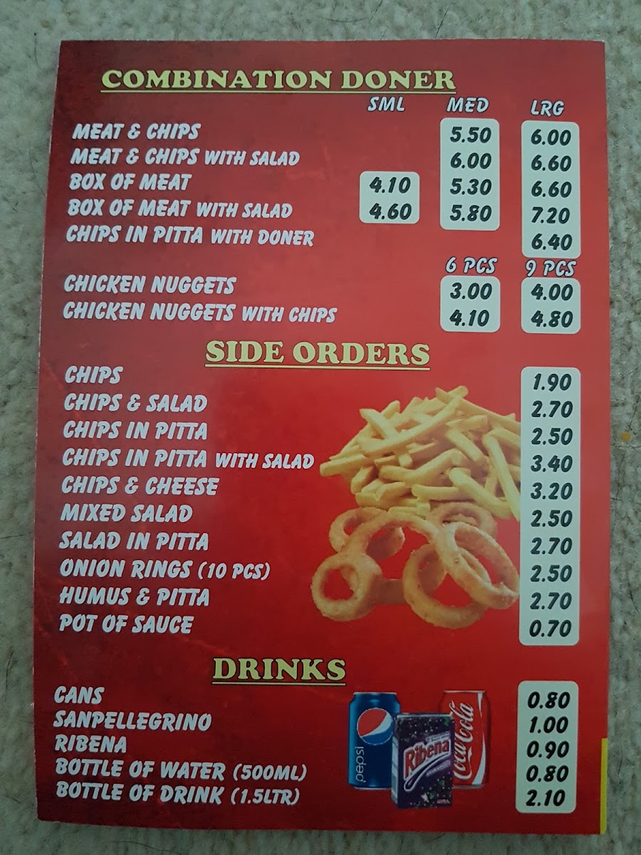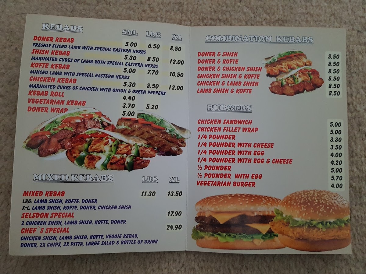 Overall, the menu balances classic kebab house offerings with a few fast-food twists, maintaining simplicity while allowing for combination meals and side choices that cater to varied tastes. The clear naming of dishes and straightforward pricing make it easy for diners to navigate, and the variety ensures that both casual visitors and regulars can find something satisfying. From traditional Doner Kebab to the inventive Selsdon Special, the menu reflects a no-nonsense approach to delivering hearty, flavorful meals that hit the spot without unnecessary frills.