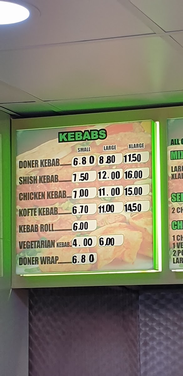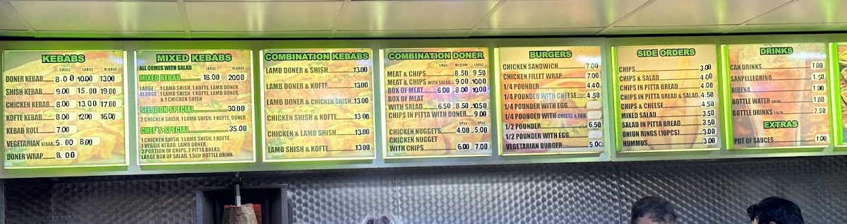 From a reviewer’s perspective, the menu at Selsdon Kebab Centre on 180 Addington Rd, Selsdon, South Croydon CR2 8LB, United Kingdom, presents a straightforward yet satisfying selection for lovers of grilled meats and quick bites. The kebabs section features classics like Doner Kebab, Shish Kebab, Chicken Kebab, and Kofte Kebab, alongside the convenient Kebab Roll. For those seeking variety, the Mixed Kebabs options, including Mixed Kebab, Selsdon Special, and Chef's Special, provide an enticing sampler. The Combination Kebabs, such as Lamb Doner & Shish, Lamb Doner & Kofte, Lamb Doner & Chicken Shish, Chicken Shish & Kofte, and Chicken & Lamb Shish, offer generous portions for sharing or hearty appetites. Those favoring a simpler mix will find the Combination Doner dishes-Meat & Chips, Meat & Chips With Salad, and Chips In Pitta With Doner-particularly appealing.